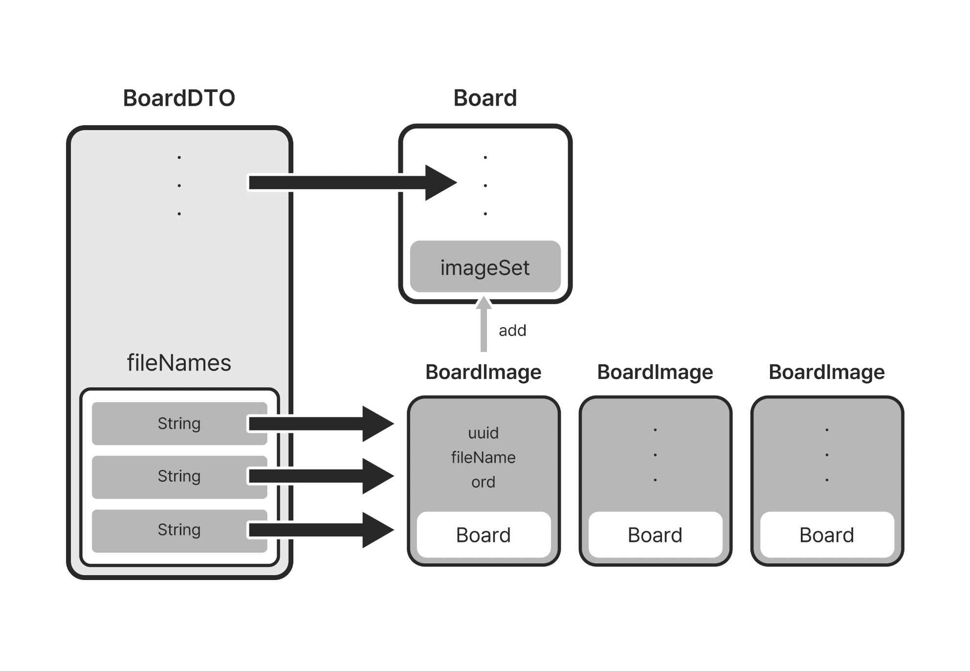 ๊ฒ์๊ธ DTO์ธ `BoardDTO`๋ฅผ DB์ ์ ์ฅํ๊ธฐ ์ํด ์ํฐํฐ์ธ `Board`์ `BoardImage`๋ก ๋ณํํ๊ณ ์ ํ๋ค.